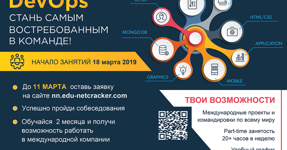 Студенты, успешно прошедшие программу обучения, смогут получить предложения о работе в Netсracker. Возможна неполная занятость (совмещение учебы и работы с гибким графиком).