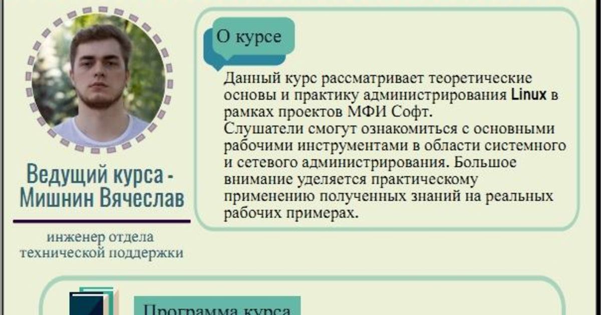 Данный курс рассматривает теоретические основы и практику администрирование Linux в рамках проектов МФИ СОФТ.