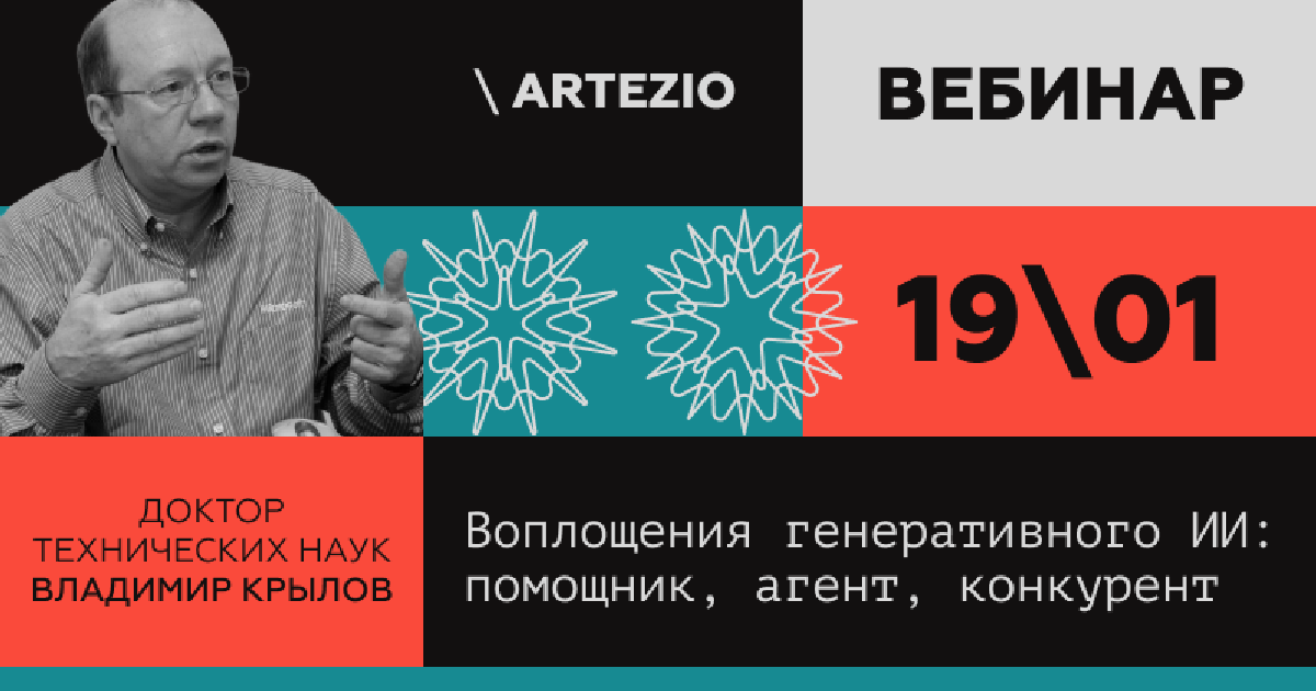 Компания Artezio приглашает вас на онлайн-лекцию «Воплощения генеративного ИИ: помощник, агент, конкурент». Лектор - профессор Владимир Крылов, доктор технических наук и научный консультант по применению ИИ в разработке ПО.