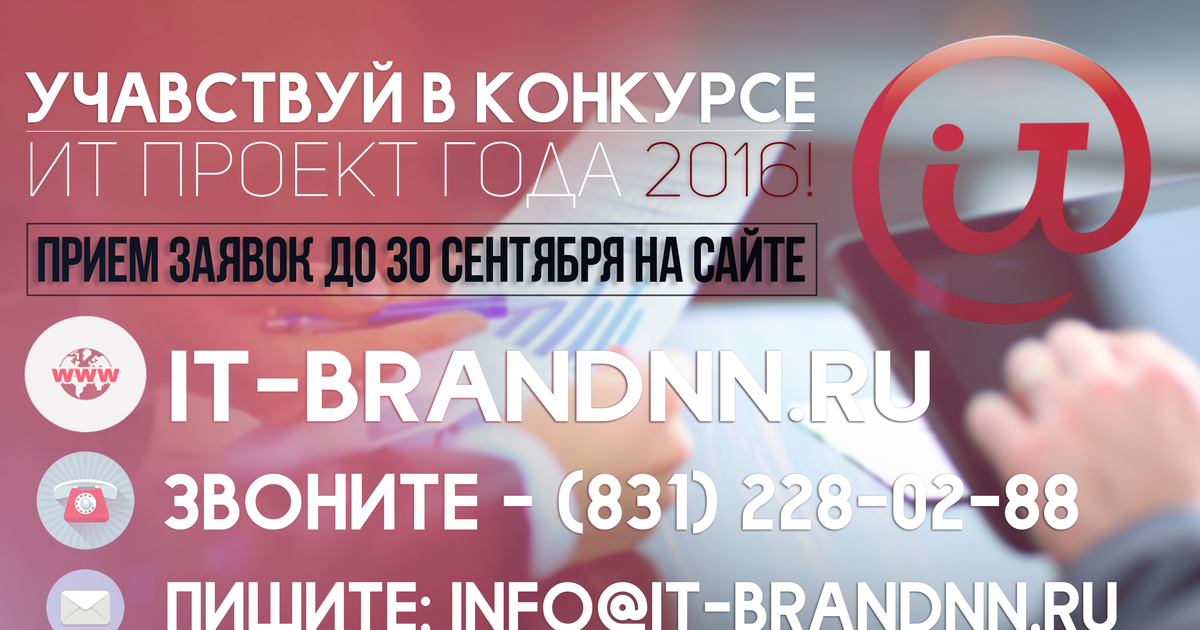 - Прием заявок на участие в Конкурсе на сайте www.it-brandnn.ru 20 апреля — 30 сентября 2016 г.
